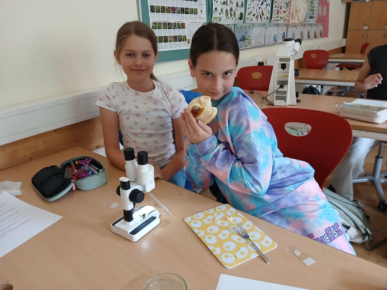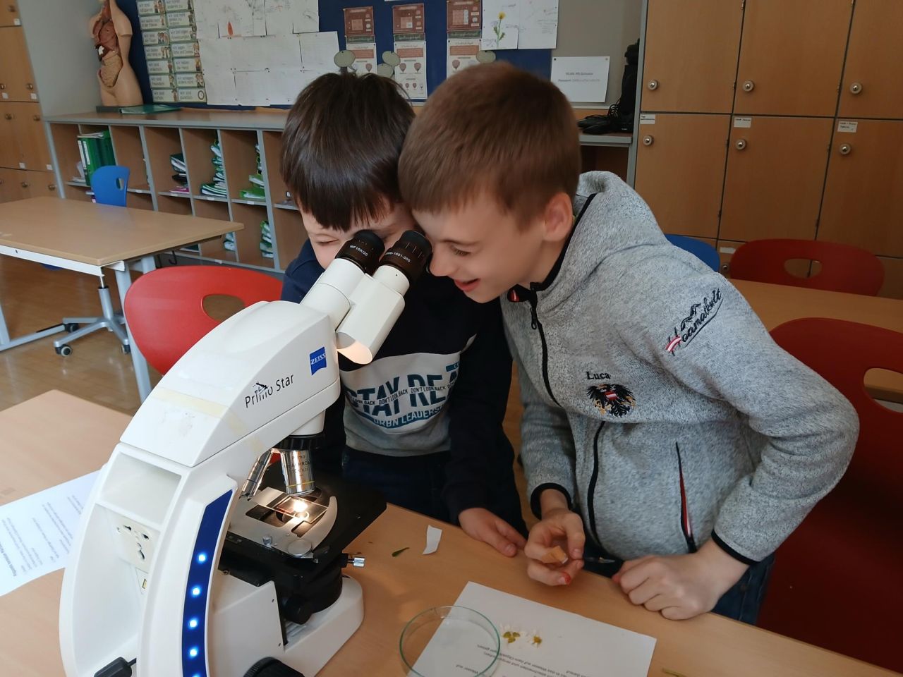 Unsere 1. Klasse durfte nicht nur einen Mikroskopierführerschein machen, sondern auch selbst Präparate herstellen – und das mit großem Eifer.