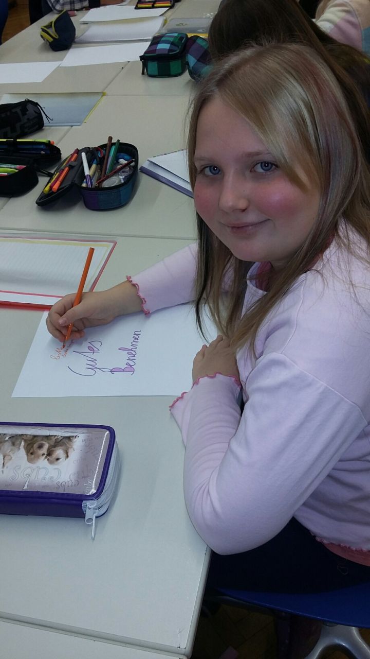 Während am ersten Tag die Erarbeitung des Begriffs „Benehmen“ im Fokus stand, gestaltete den zweiten der drei Projekttage zum großen Themenkreis „Gutes Benehmen“ Dipl. Päd. Karin Matzer. Er handelte von all jenen Dingen, die den so wichtigen ersten Eindruck ausmachen: Kleidung, Gang, Haltung, Körpersprache, Mimik sowie persönliche Hygiene und Verhalten bei Tisch.