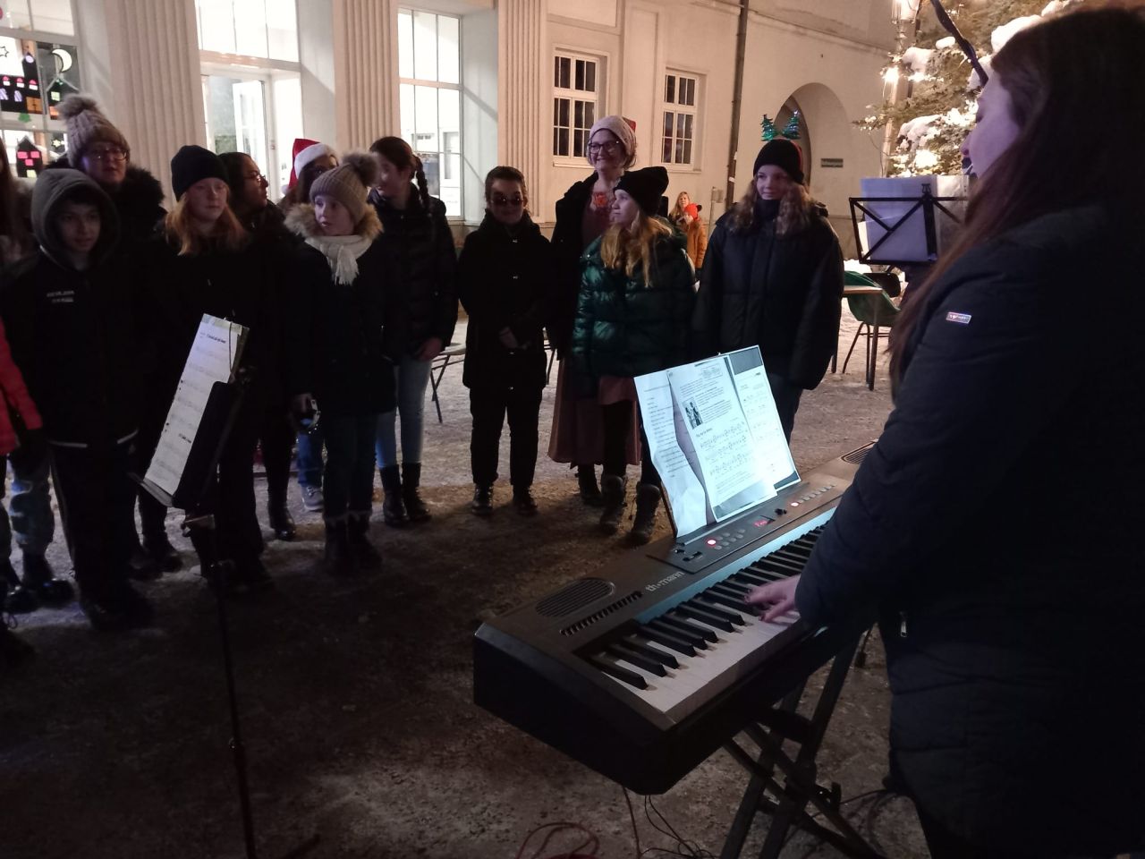 Der Chor unserer Schule, unter der Leitung von Patricia Plank, begeisterte das Publikum mit einem eindrucksvollen Repertoire. Von traditionellen Weihnachtsliedern bis hin zu modernen Klängen zeigten die Schülerinnen und Schüler ihr musikalisches Können und verliehen der Krippeneröffnung eine besondere Note.